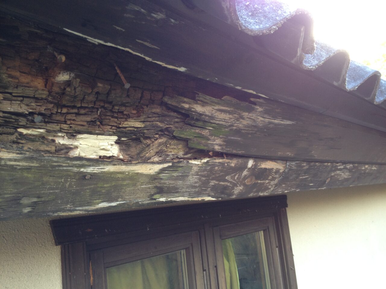 屋根まで梯子をかけたついでに、軒天が変色したり腐っている部分があったのでそこも調べてみました。屋根材(波型スレート)の釘が浮いており、一部がクラックして雨漏りしているようです。すぐにどうにかしなければいけないような状態でもなかったので、防水テープで応急手当だけしておきました。