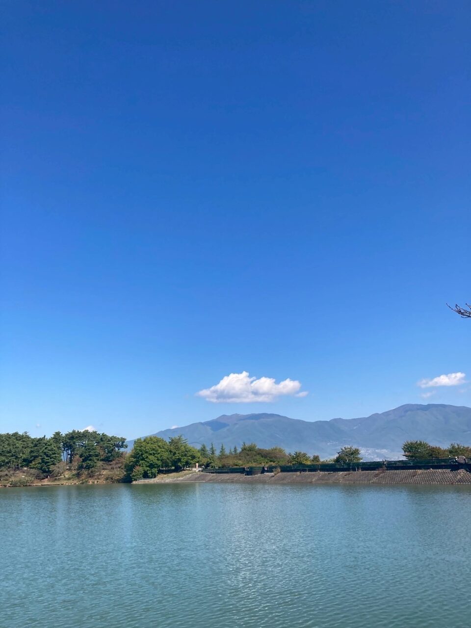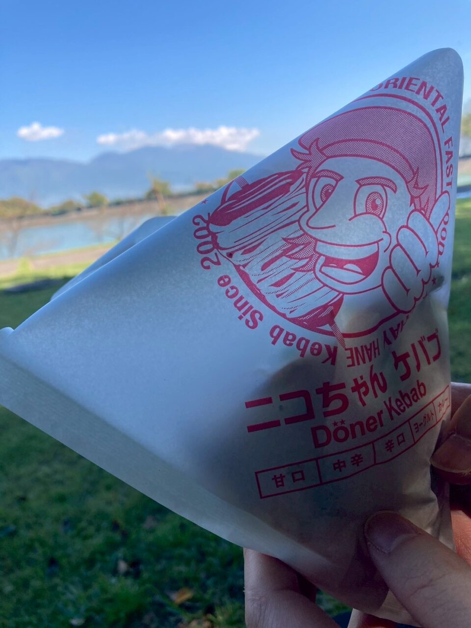 公園中央にある湖のほとりでドネルケバブを食べました。向こうに見えるのは浅間山だと思います。