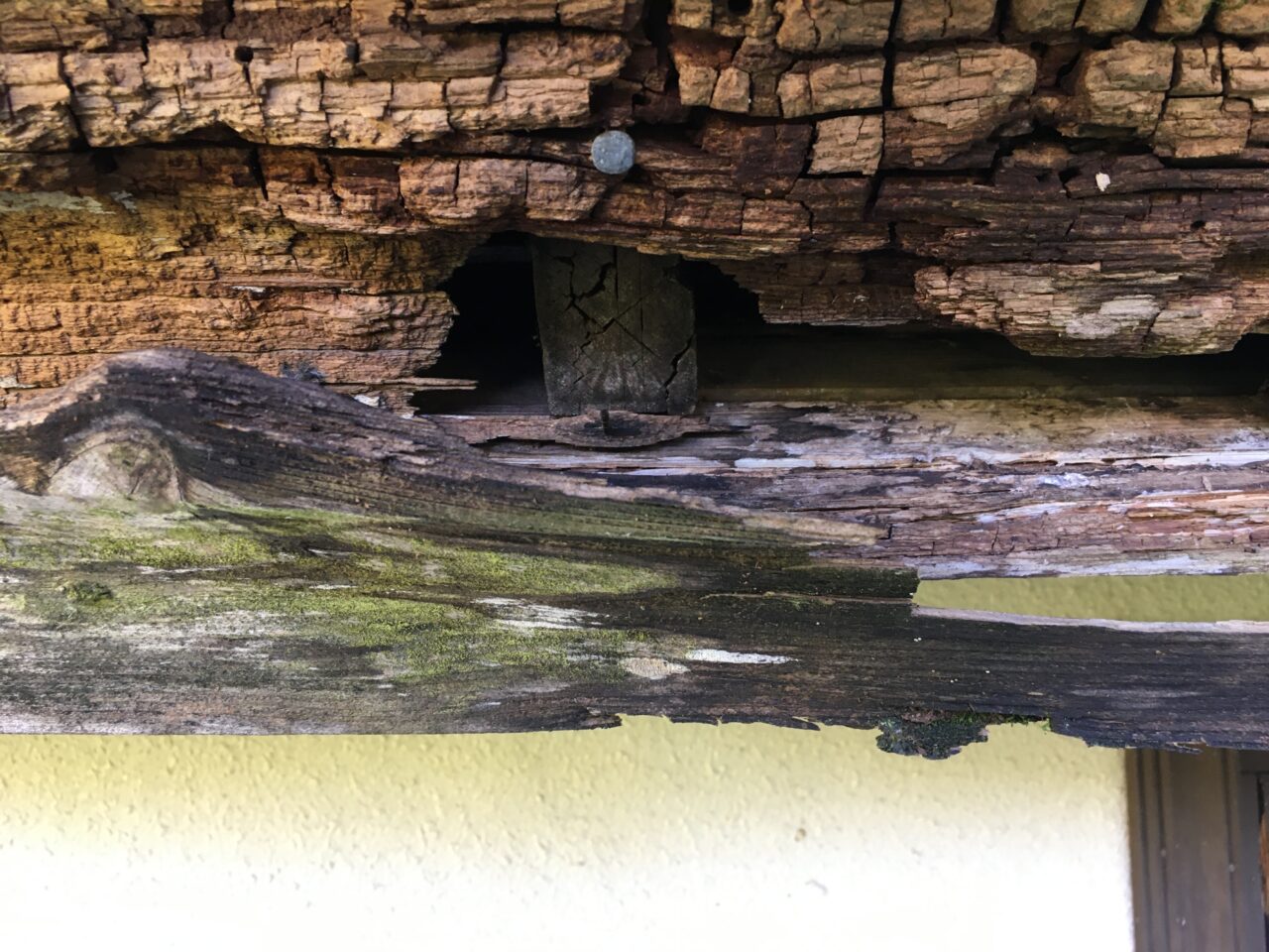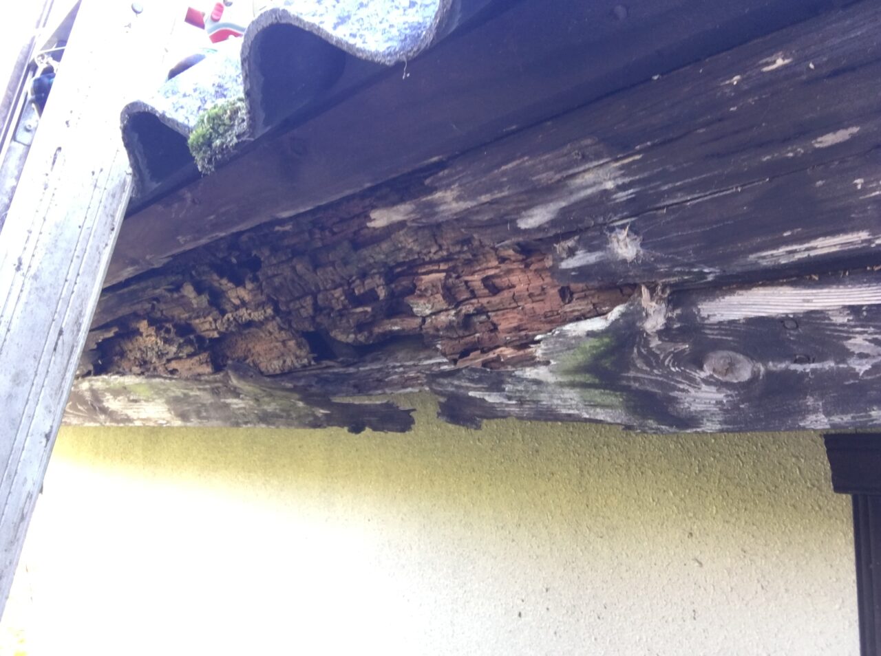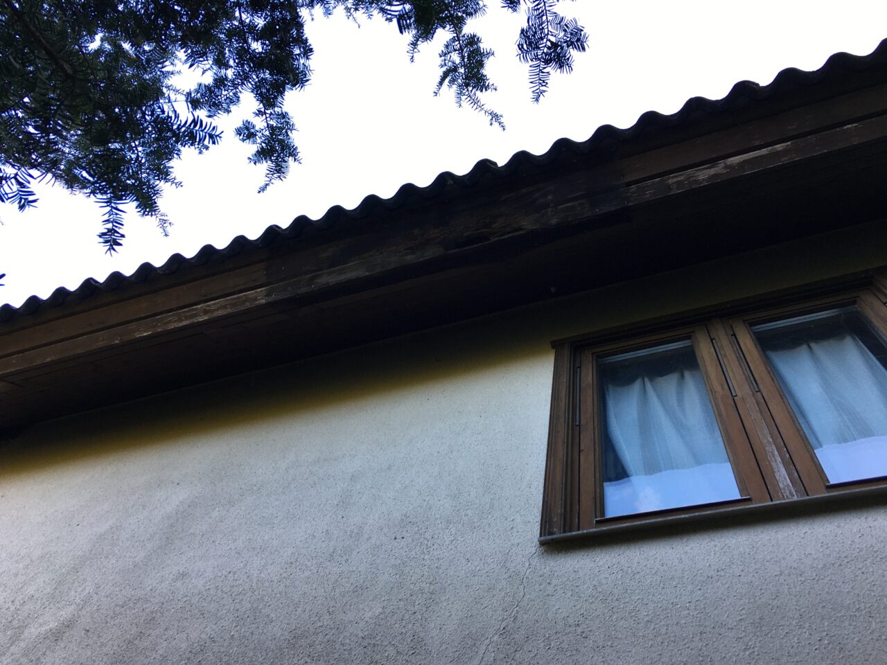 雨漏りしている部分の鼻隠し(はなかくし)は腐ってボロボロになっています。6年前より若干広がっている気がします。室内に影響はないのでほっからかしていますが、そのうち修繕したいと思っています。