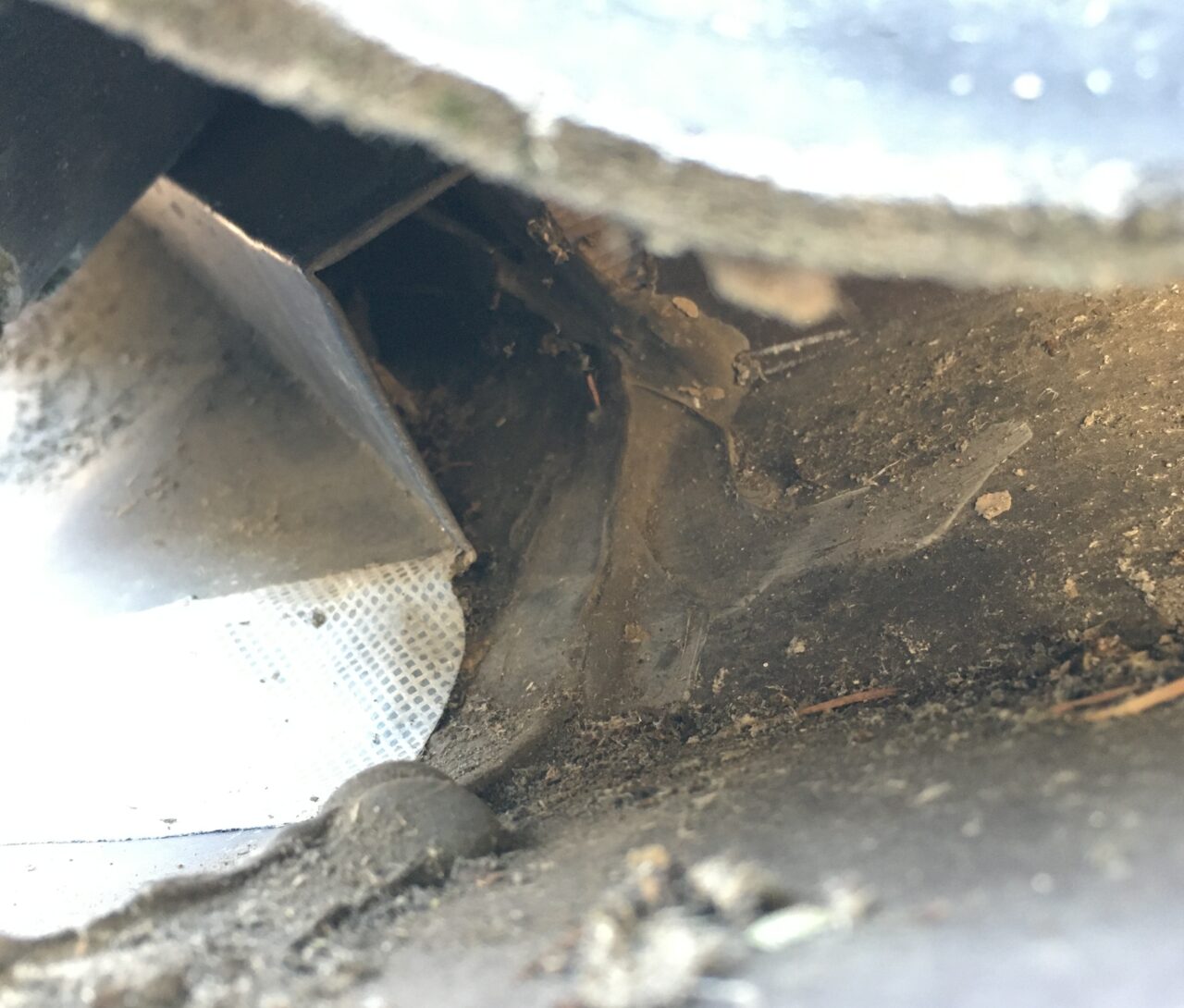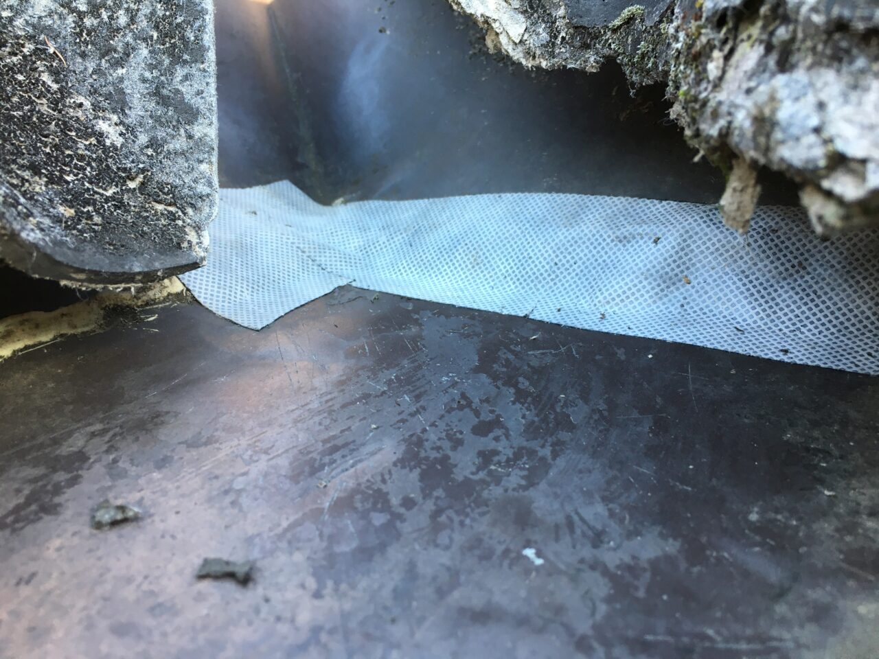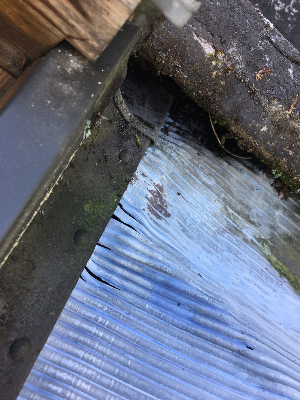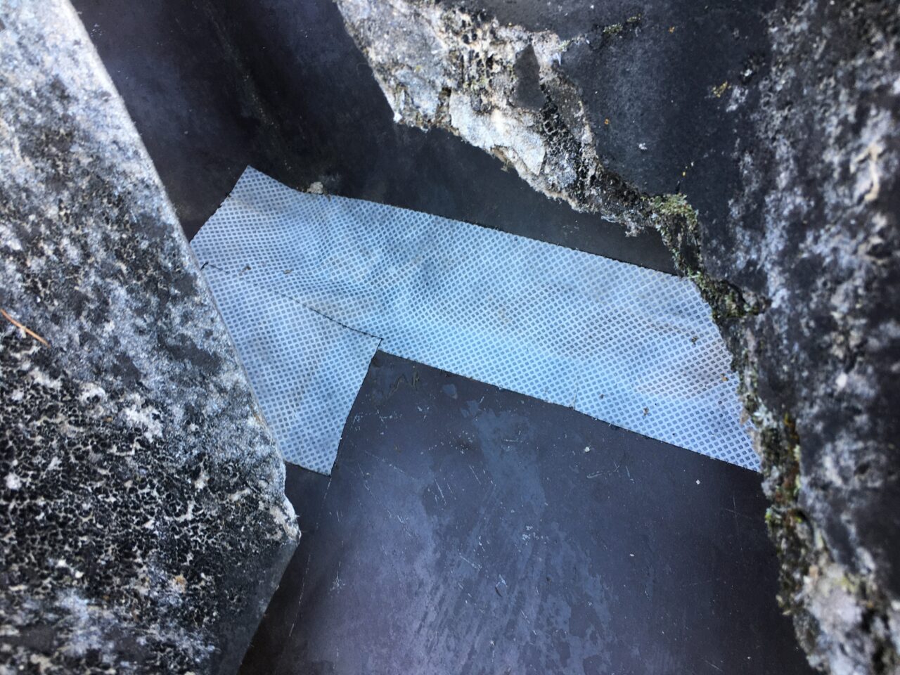 過去に数回確認された玄関の雨漏りは、屋根の掃除を定期的に行うことで概ね改善されています。こちらは豪雨のときに雨水が谷樋に集まり、さらに落ち葉などがダムになって流れが悪くなることで、オーバフロウした水が玄関に流れてくるという仕組みのようです。コーキングが劣化して割れている部分があったので、防水テープを貼っておきました。