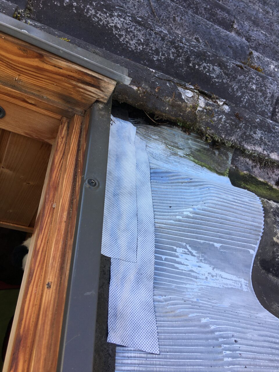 改めてどこから雨漏りしているのか観察してみたところ、天窓のエプロン(白い部分)が劣化して割れていたので防水テープで補修しておきました。