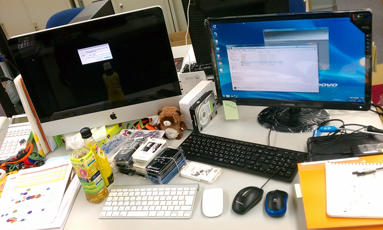 残業中。iMacの右下にタヌキのぬいぐるみがいます。不用品ボックスからレスキューしました。