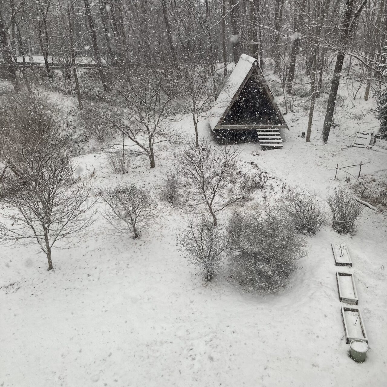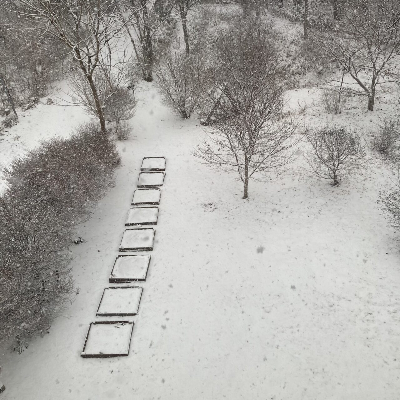 昼からまとまった雪が降り、庭の景色が白くなりました。しばらく寒い日が続く予報なので、これが根雪になりそうです。