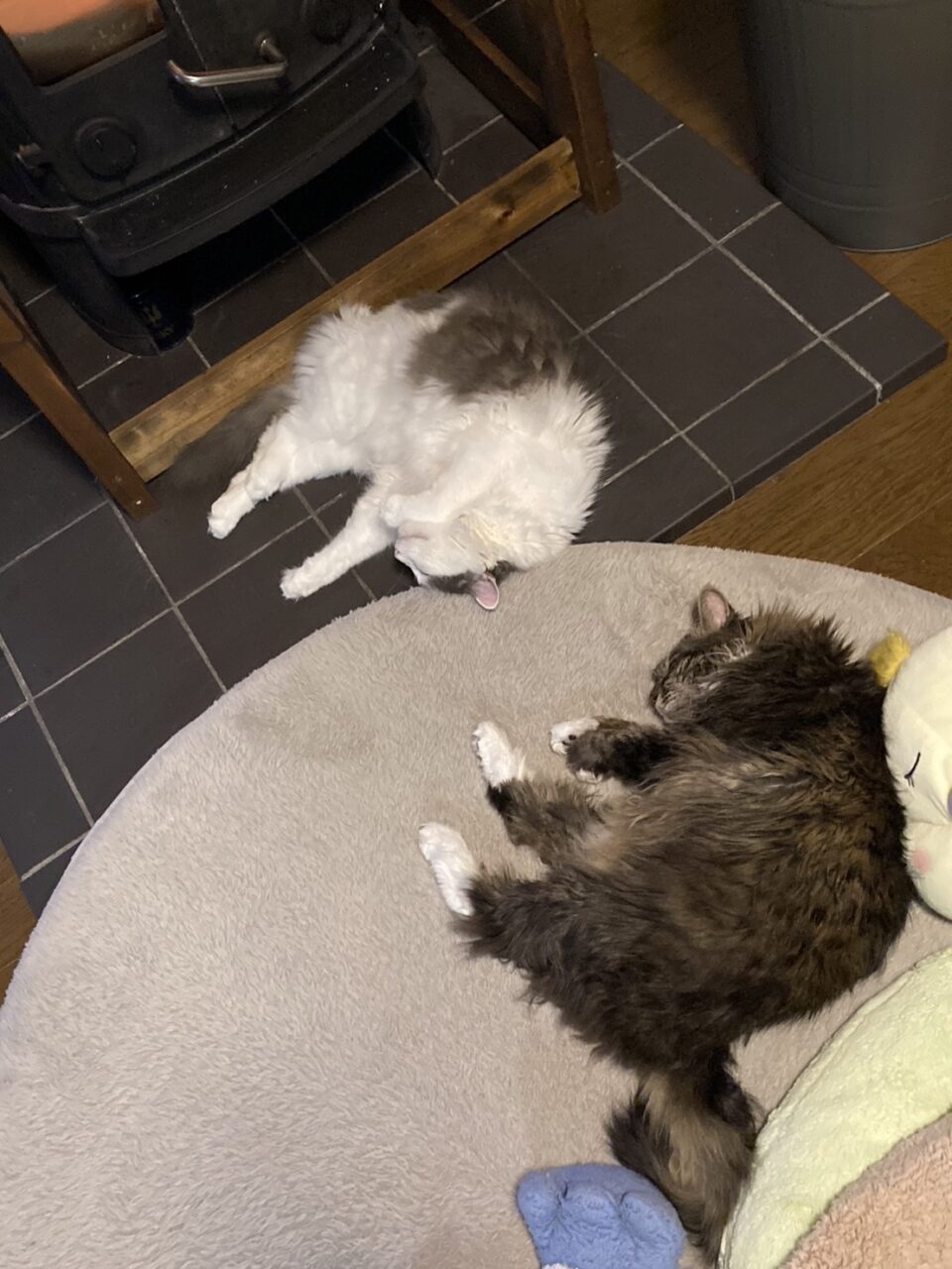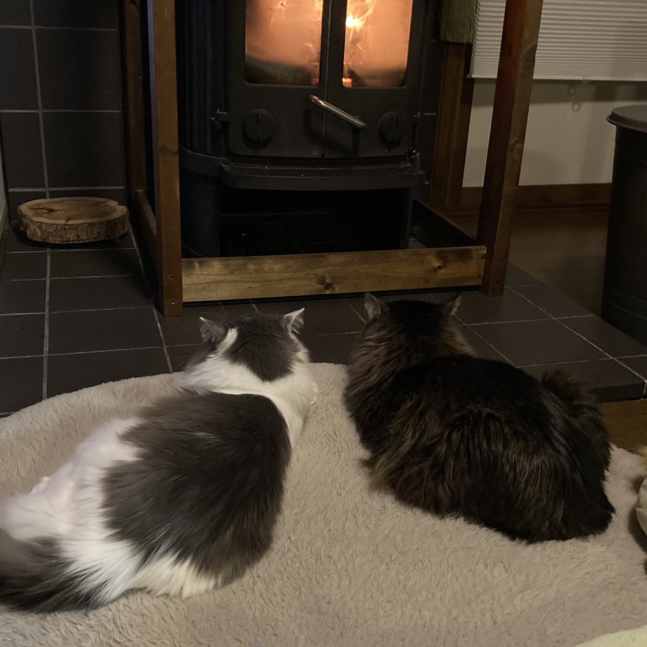 帰宅後は、買った食料や日用品を片付けて、薪ストーブに火をつけ、コーヒーを淹れて一息ついたら日が暮れ始め、あっという間に一日が終了。猫たちはいつものように薪ストーブ前で陣取り合戦をした後、一緒に寝ていました。