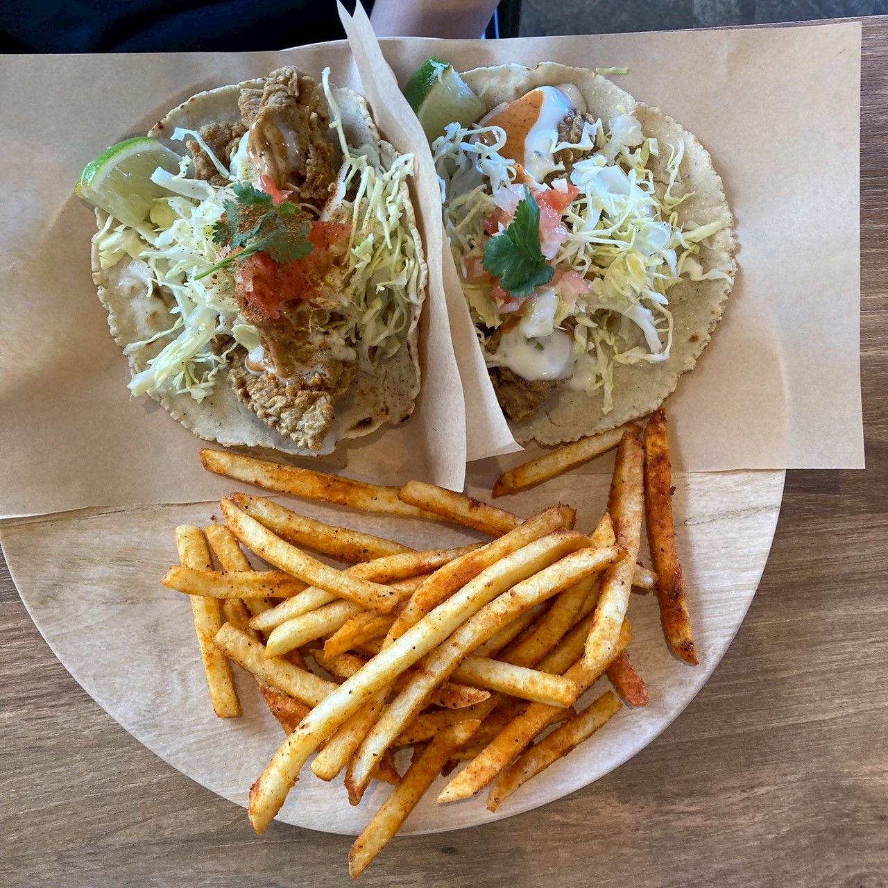 ランチはボーリング場の近くのフライドチキン店「THE CHICKENS」でチキンタコスを食べました。タコスの皮はトウモロコシを使ったコーントルティーヤでした。自宅でタコスを作るときは調理が簡単で包みやすい小麦粉のトルティーヤを使うので、外食のときは作るのが面倒くさいコーントルティーヤだと得にした気分になります。