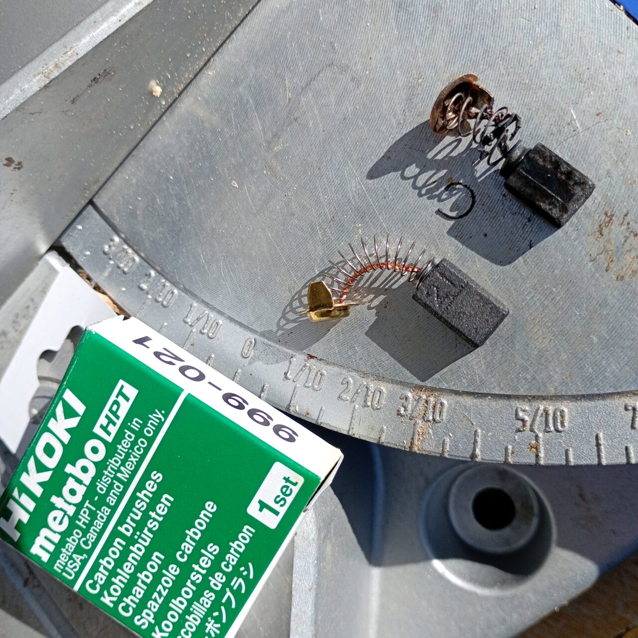 チップソーを取り外して本体内部の木くずをブロアで吹き飛ばし、油汚れは雑巾で掃除。カーボンブラシはすり減って真っ黒になっていたので新品に交換しました。回転が止まる原因はカーボンブラシの摩耗だったらしく、交換正常に動くようになりました。