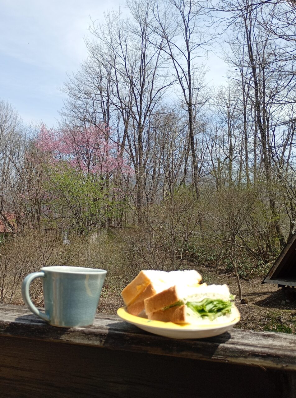 庭の桜 2026.4.20 ブログ ガーデニング 庭の桜が見頃を迎えたので、デッキにキャンピングチェアを持ってきてサンドイッチを食べました。桜花爛漫と呼ぶには花のボリュームが少ないかもしれませんが、老木なのでこれが満開(あるいは限界)なのです。 折りたたみ式のチェアは、LOGOSの「neos ラップドチェア」です。シートが低く、ソファのように沈み込むので、長時間座っても疲れませんが、食事向きではありません。 猫たちは留守番をしていました。