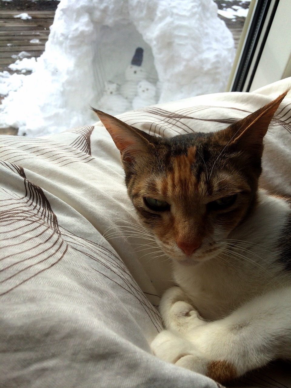 昨晩からまた雪が降り、10cmほど積もりました。屋根に積もった雪が部屋の熱で溶けて滑り落ちてきている様子です。